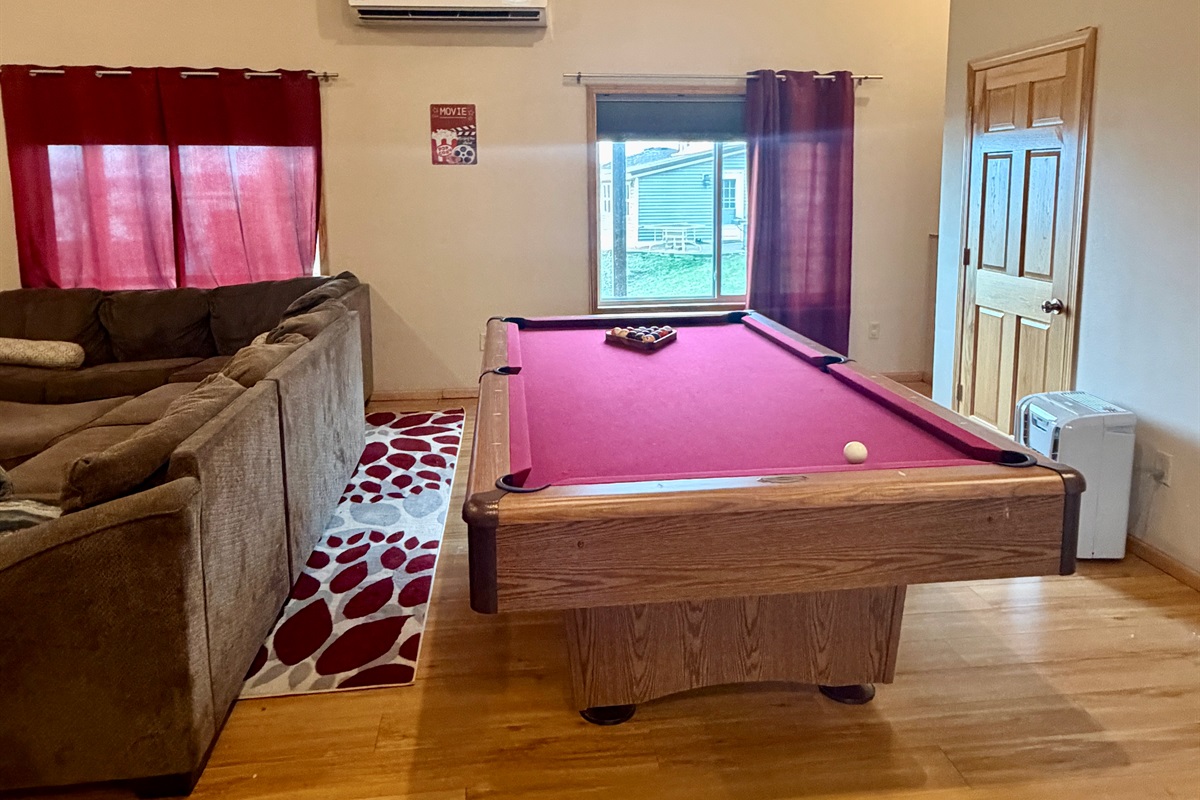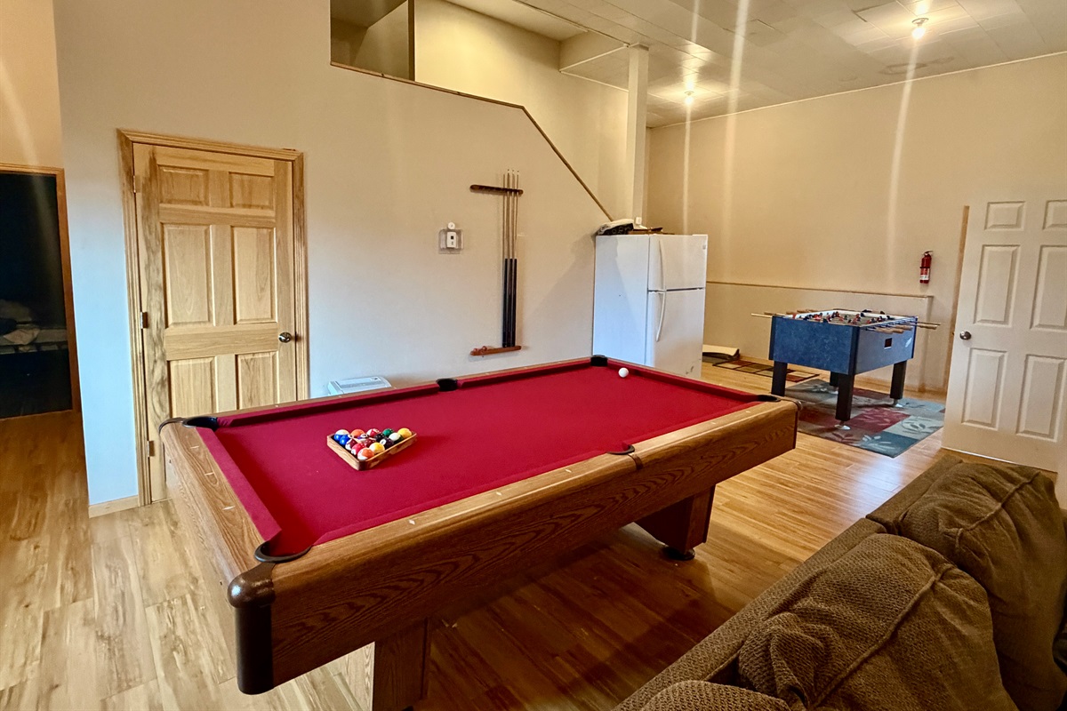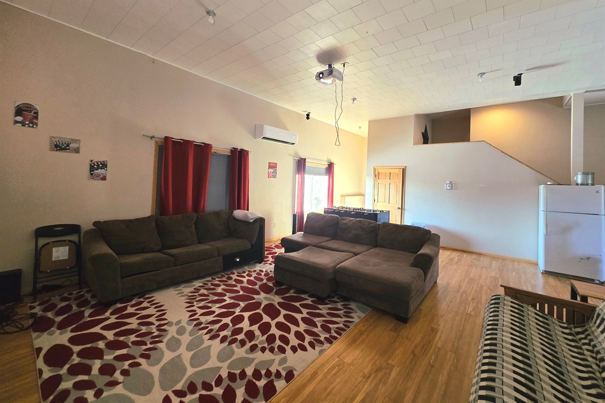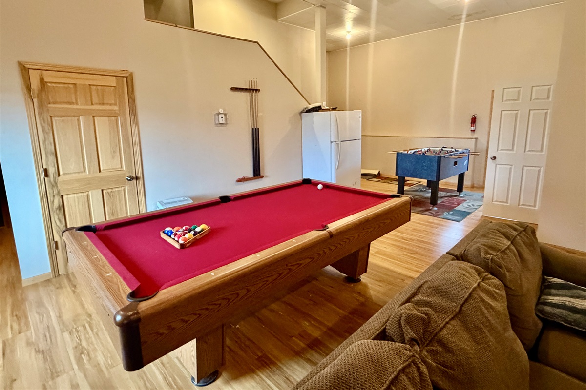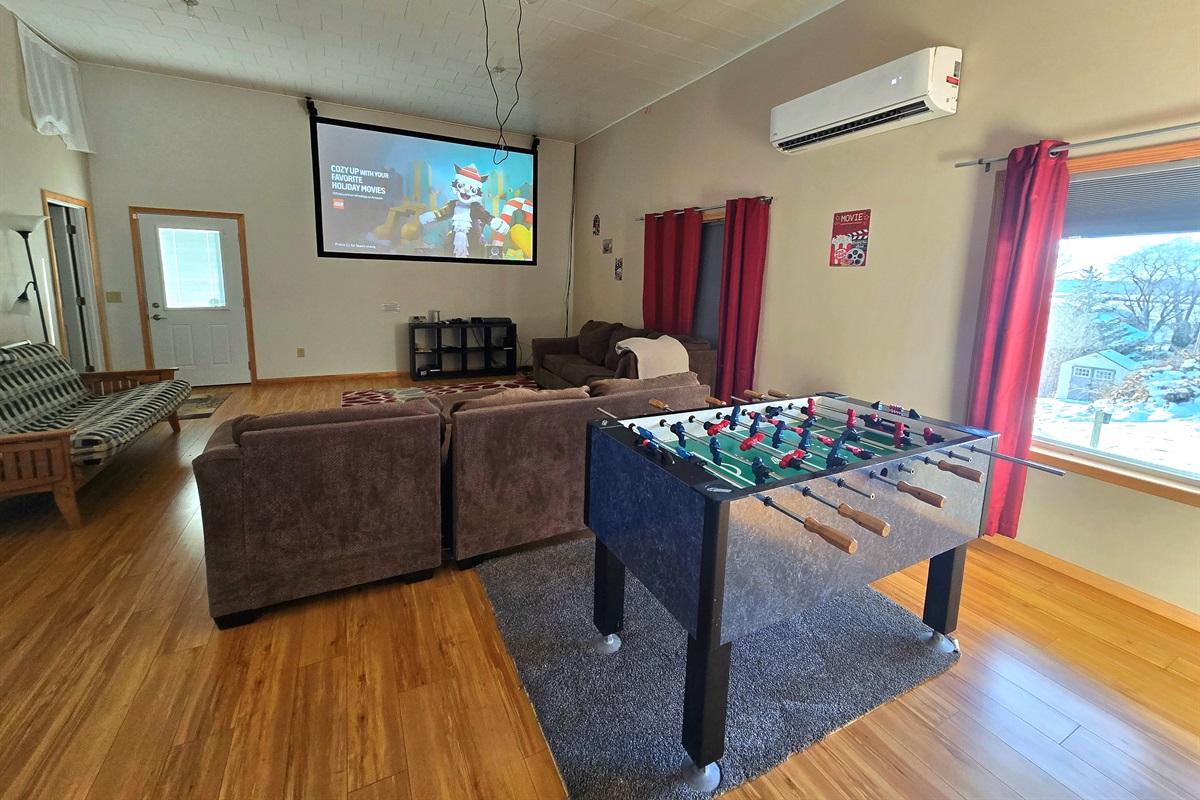 Lower level has 3 additional bedrooms- 2nd living room with projector and foosball table, another full bathroom and another half bath. Single fridge downstairs for beverages. Walks out to covered by the deck hot tub.